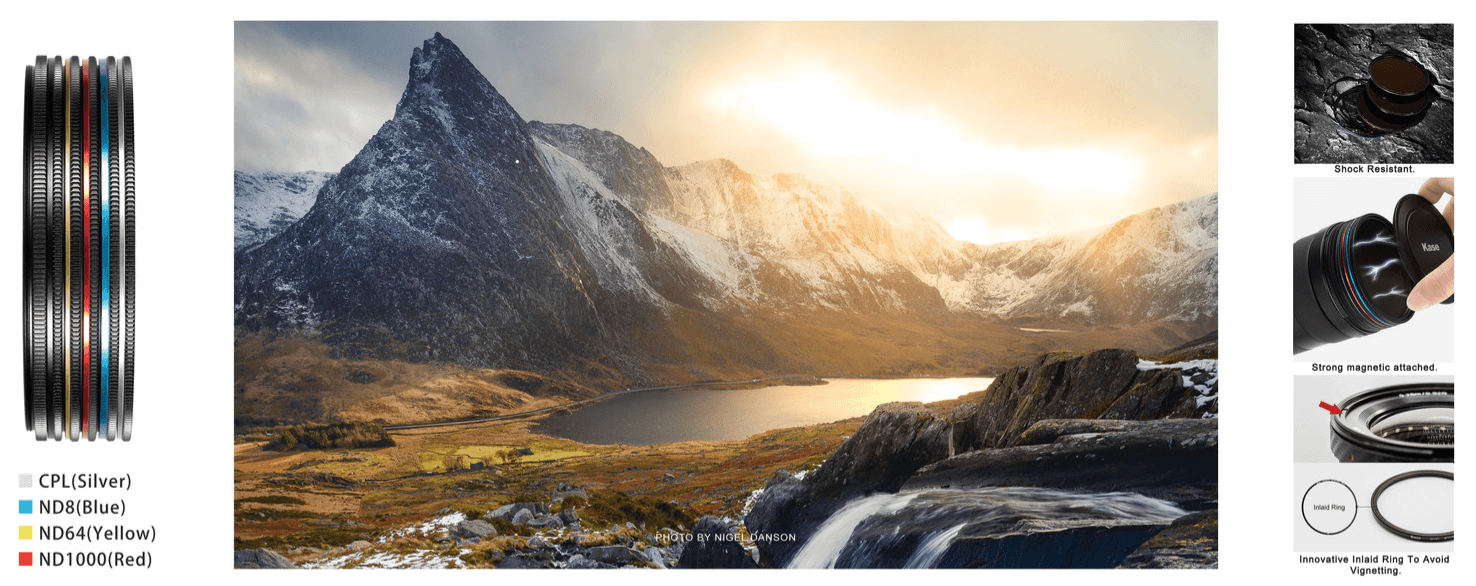 Die Kase KW Revolution Filter-Sets enthalten in der Regel eine Reihe von Neutraldichtefiltern (ND) und einen Zirkular-Polarisator (CPL). Das Standardset besteht aus ND8 (3-Stop), ND64 (6-Stop) und ND1000 (10-Stop) Filtern sowie einem CPL-Filter. Diese Filter sind magnetisch und können dank ihres farbcodierten Designs leicht gestapelt und ausgetauscht werden.